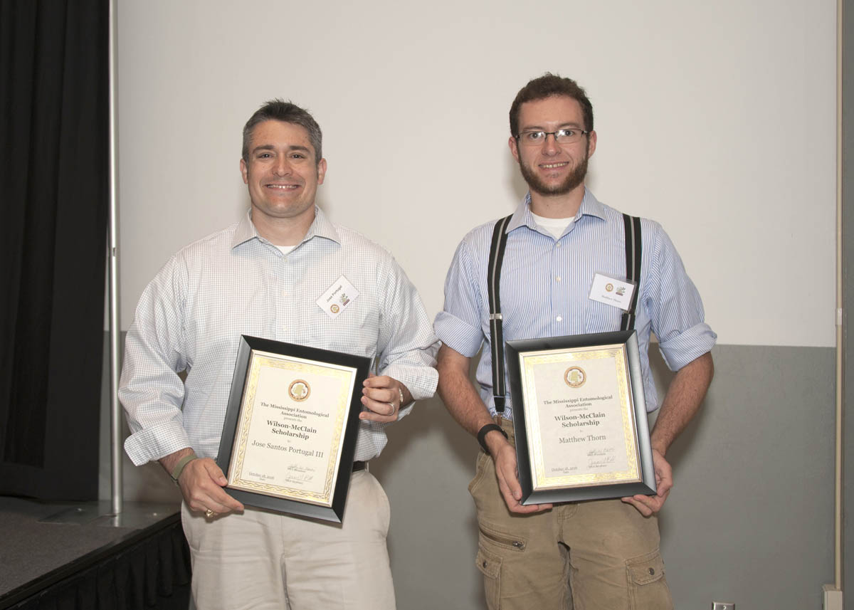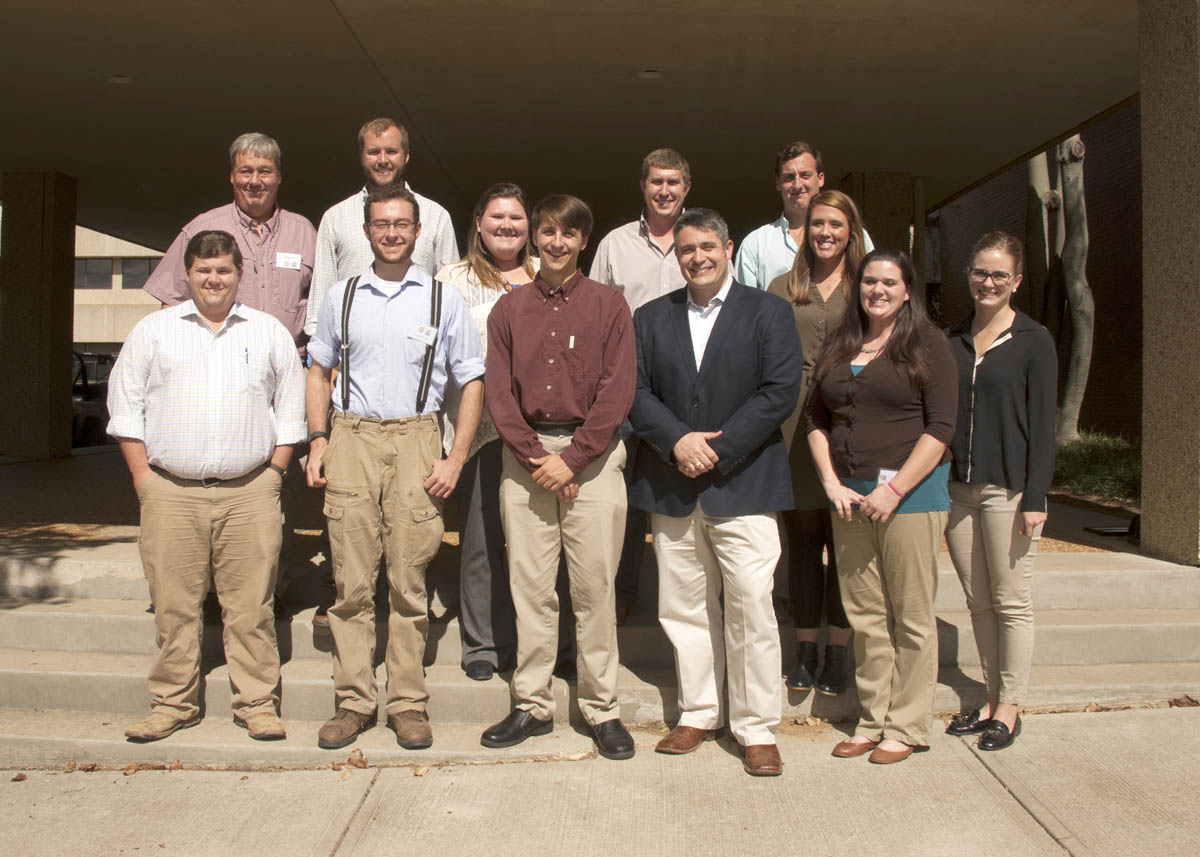 Back row, left to right: Outgoing MEA president Jeff Harris, Ben Thrash (1st place, PhD paper), Chelsea Darnell (1st place, Masters Paper Sec 1), Nick Bateman (2nd, PhD Paper), Whitney Crow (2nd, PhD Poster), Tyler Towles (1st, Masters Paper, Sec 2); Front row, left to right: Ty Smith (2nd, Masters Paper, Sec 1), Matthew Thorn (2nd, Masters Poster), James Clements (1st, Undergraduate Poster), Santos Portugal (1st, PhD Poster), Sara McGinnis (2nd, Masters Paper, Sec 2), and Ellie Moen (1st, Masters Poster). (photo by Kat Lawrence) |