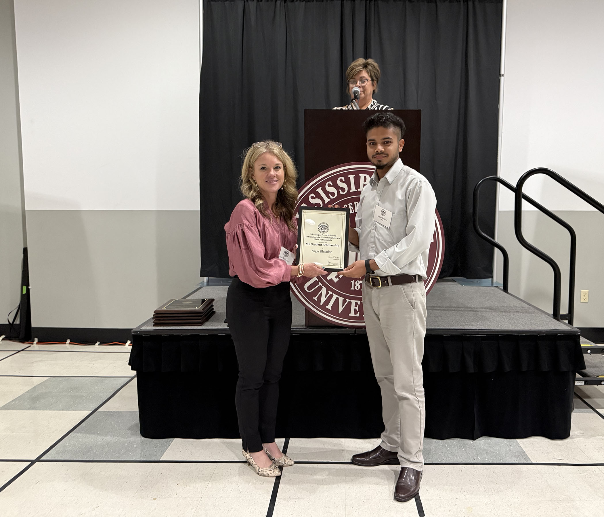 Sagar Bhandari, recipient of the 2025 MEA Graduate Student Scholarship (Masters), presented by Tessie Wilkerson, MAENPP President |